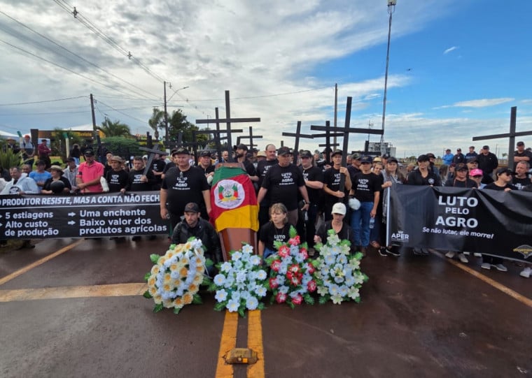 Cruzes pretas e um caixão coberto com a bandeira do Rio Grande do Sul marcaram o protesto de produtores rurais no primeiro dia da Expodireto Cotrijal, iniciada nesta segunda-feira (9), em Não-Me-Toque. A manifestação percorreu o parque da feira com críticas à situação financeira no campo e reivindicações dirigidas ao governo federal, ao sistema financeiro e a empresas de biotecnologia.